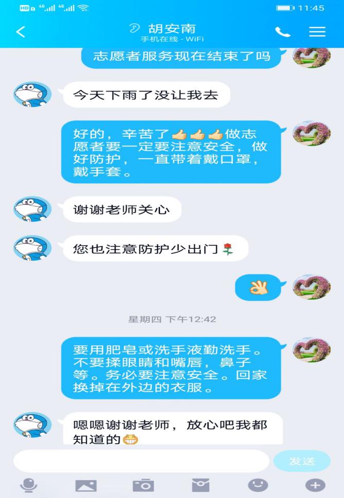 引导健康生活,过有意义假期。辅导员在注重教育引导同学在居家防控疫情的时,还倡导学生要以积极健康的生活方式,为防控疫情工作做出一名新时代大学生应用的贡献,度过有一个有意义的超常假期。数学与统计学院刘全亚老师通过网络资源动员学生在家积极锻炼身体,做一名有健康生活习惯的新青年。联系参加疫情防控的学生是生命科学学院高欢老师每天要做的事,安全、健康、科学防护成为聊天过程中的不变话题。