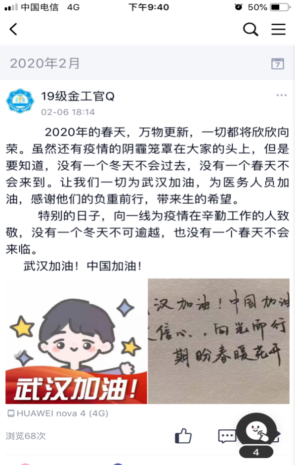 立足工作岗位,加强思想引导。辅导员们利用个人微信公众号、QQ群、QQ空间等为疫情防控加油,进一步增强学生们的抗疫信心。经济管理学院陈梦莹老师在“莹哥话真多”个人微信公众号编发4篇文章,传播居家防控疫情的正能量文章。同时,她还在“抖音”平台开了直播,教育引导学生们树立理想,粉丝高达5万多,汇聚社会正能量。