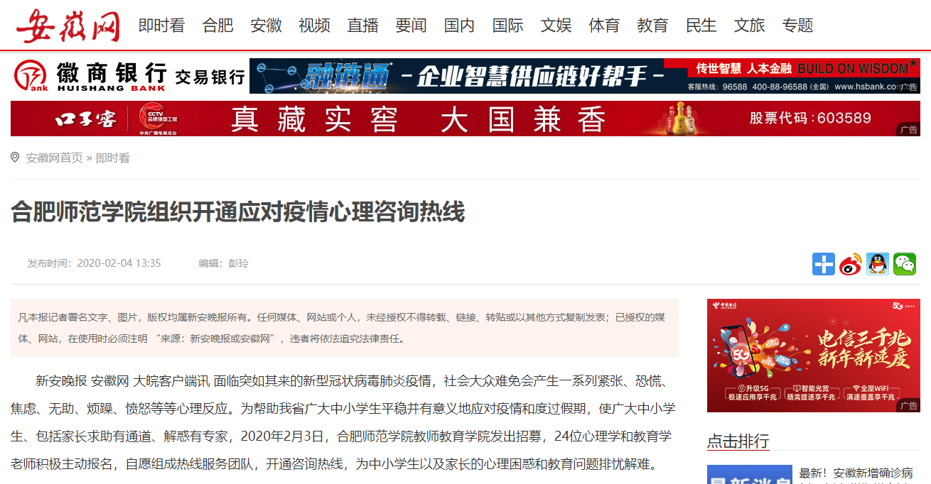 此前,学校与安徽省教育学会合作编写了“安徽省中小学生应对新型冠状病毒肺炎疫情心理自助指南”,为配合“指南”具体开展心理咨询工作,beat365唯一官方网站副院长、教育部中小学心理健康教育指导委员会委员姚本先教授亲自协调和指导,并直接参与热线咨询工作。咨询和辅导形式主要通过电话和在线咨询进行,具体时间为每天上午9:00—12:00,下午2:00—5:00,晚上7:30—9:00。