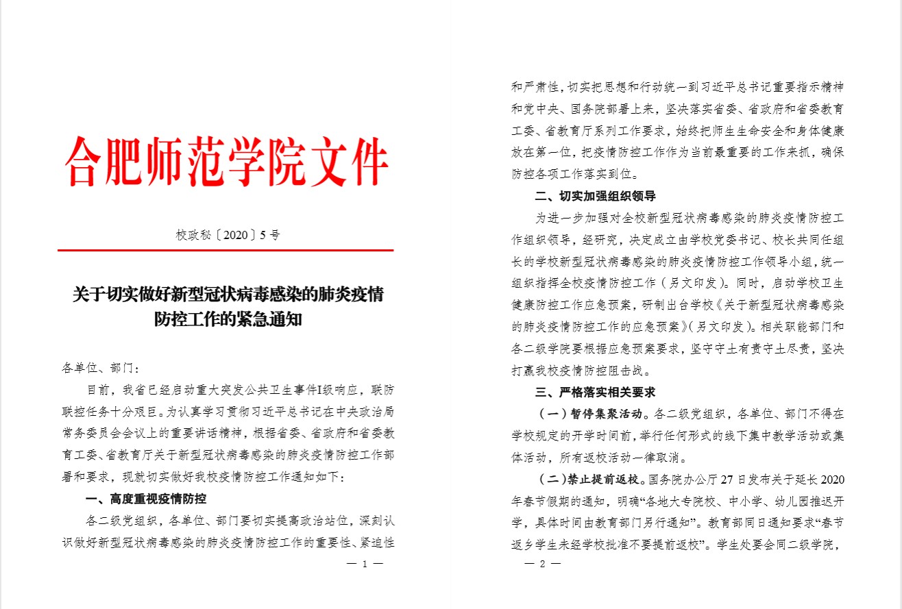 加强组织领导,强化全面部署。校党委及时成立疫情防控工作领导小组,由党委书记徐成钢、校长孙道胜同任组长,其他校领导任副组长,各二级学院党政主要负责人同时为成员,有效保障学校疫情防控工作党委领导、党政齐抓、校院联动。领导小组成立后,迅速启动运行,召开专题会议,系统学习传达上级有关会议和文件精神,全面研究部署和落实各项防控措施,及时制发《切实做好新型冠状病毒感染的肺炎疫情防控工作紧急通知》及相关工作方案,明确暂停集聚活动、禁止提前返校、暂停校园开放、强化宣传引导、密切开展监测、依规应急处置、开展卫生整治、做好开学预案、加强值班值守、严格督促督查等十个方面的重点工作安排,细化任务分解,明晰工作要求,严明工作纪律,压紧压实责任。为强化任务落实,校领导带头深入校园,检查督导,有力推进学校防控工作迅速、全面、有序展开。
