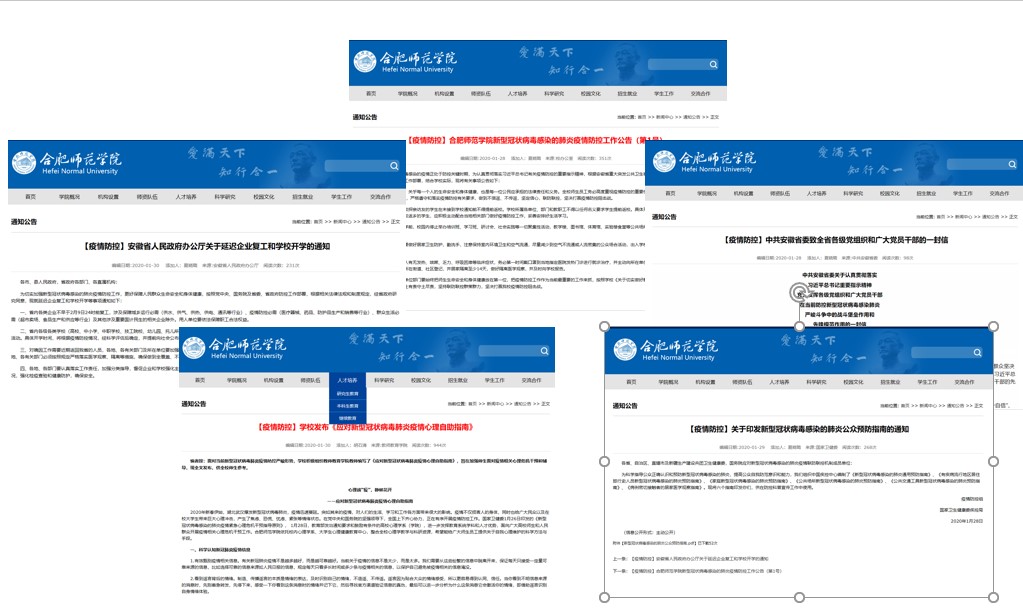 实施联防联控,强化落细落实。在学校领导小组统一指挥下,领导组办公室加强统筹协调和督促检查,及时建立疫情防控工作微信群,及时建立师生安全信息“日报告”和疫情防控工作信息“日报告”制度,牵头发布面向全校师生的信息公告,随时保持与上级主管部门、地方政府、卫生健康部门的沟通协调,确保响应及时、信息畅通。组织部牵头面向全校各级党组织和广大党员干部发出“让党旗在防控疫情斗争第一线高高飘扬”的倡议。纪委办按照中纪委、省纪委要求,迅速展开疫情防控监督检查。宣传部第一时间在校园网主页开辟“疫情防控”专栏,及时发布疫情防控官方讯息,避免信息混乱,引导科学防控。人事处、学生处、研究生处、国际交流与合作处、滨湖校区综合管理办等部门同步行动,会同各学院对全校师生进行全面摸排,重点监测近期去过武汉或师生员工中接触过疫情发生后从武汉离开者的健康状况,实时掌握师生员工寒假期间行程动向,做到底数清、动态明。学生处、团委等通过学工联动网络,及时把学校有关部署安排和要求传递每一名学生,确保全覆盖、无遗漏。教务处、研究生会同各二级学院及早研制调整开学时间预案和开学后教学安排调整预案等。后勤处组织发动校医院、各物业服务单位,全面加强校园特别是教学、办公、宿舍、食堂等重要场所的卫生安全管理,及时采购消毒防护用具,设置隔离室,制定应急预案。保卫处及时制定校门安全管理应急措施,严格校门出入登记,加大校园巡查力度。信息技术中心加排校园网络安全值班,确保校院信息安全。资产处、财务处、工会等部门密切配合,为疫情防控人力物力调配提供有效保障。