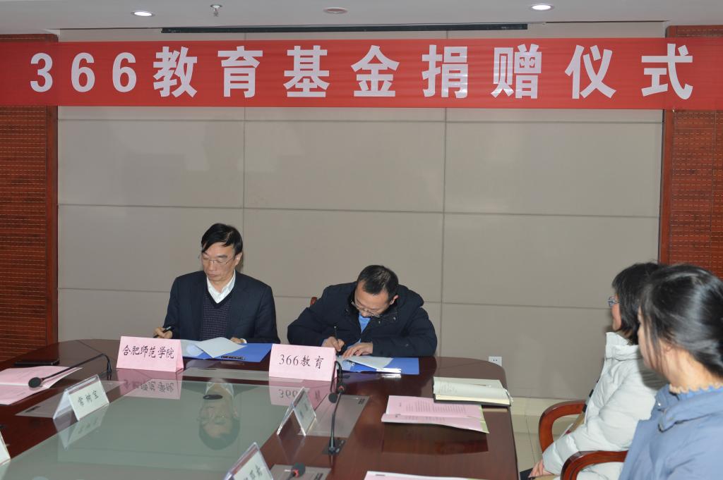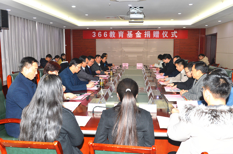 8日下午,学院在锦绣校区行知楼2008会议室隆重举行了“366教育基金捐赠仪式”。院党委书记徐成钢,党委副书记、院长孙道胜,副院长姚本先,366教育投资有限公司董事长周扬海校友,以及在该公司工作的我院英语、物理、数学等专业校友胡义胜、徐国庆、周星、程墨、胡邓南等共同出席了捐赠仪式。院发展规划处(校友办)、教务处、办公室、科研处、财务处、国际合作与交流处、外国语学院、物理与材料工程学院、数学与统计学院等单位负责人和教师代表参加了捐赠仪式。捐赠仪式由孙道胜主持。