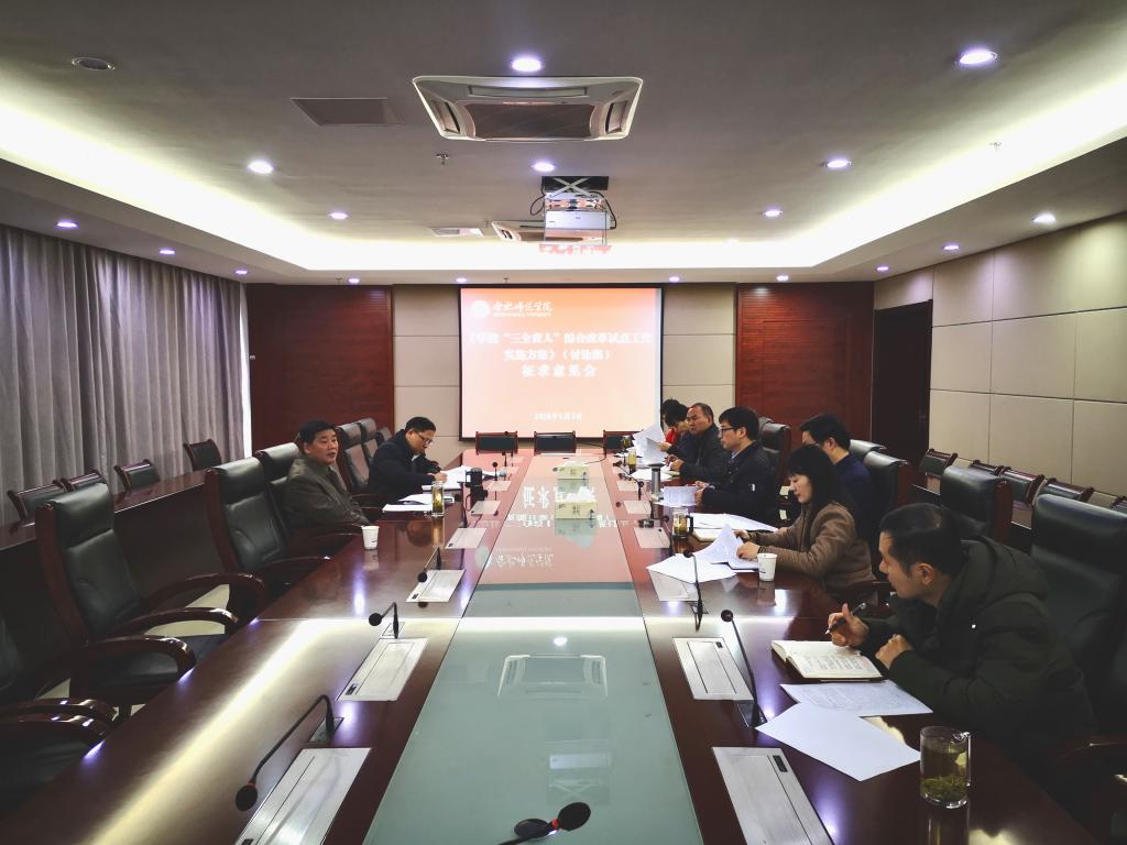 本网讯 1月3日上午,学院在锦绣校区2008会议室召开“三全育人”综合改革试点工作实施方案征求意见会,党委副书记吴昕春出席会议并讲话,办公室、组织部、宣传部、人事处、教务处、科研处、学生工作(部)处、团委等部门负责同志参会。会议由党委委员、宣传部部长操申斌主持。