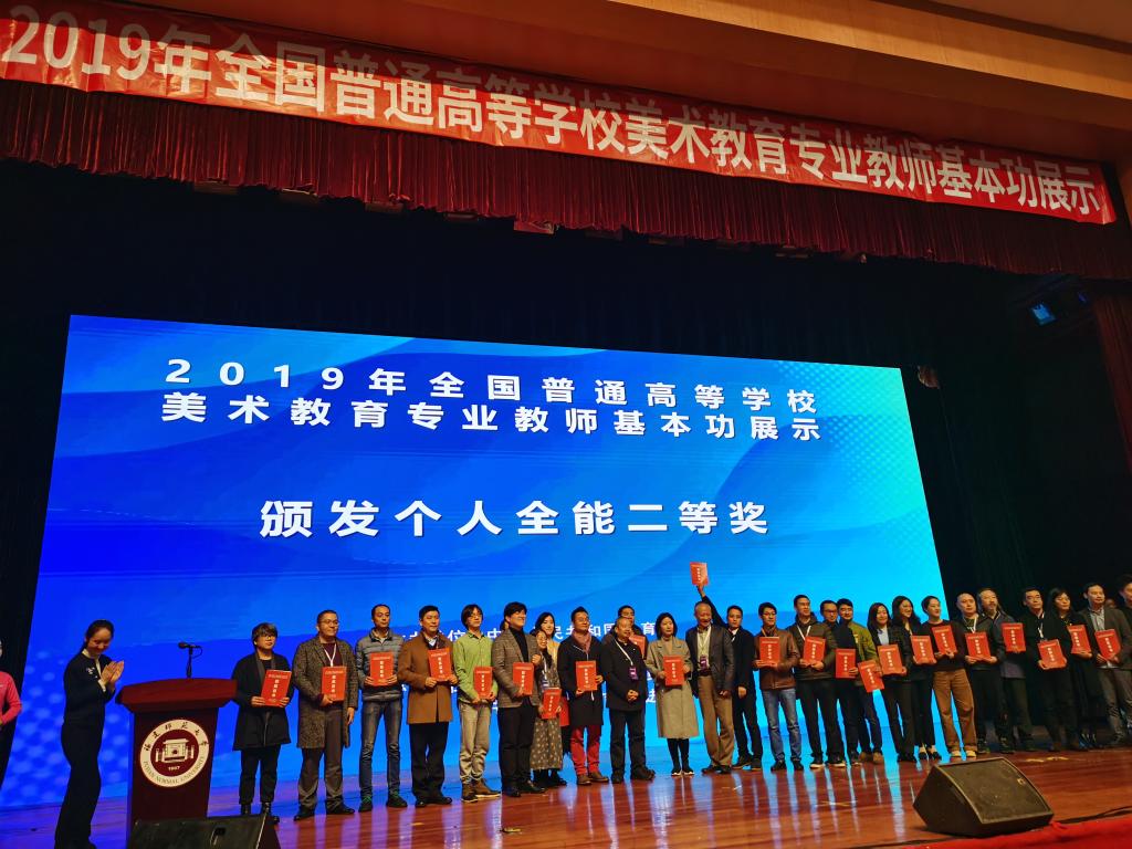 2019年全国普通高校美术专业教师基本功展示分为实践组和理论组两个组别,每组分设教学展示、专业能力展示、经典作品赏析三个项目。在本次展示活动中,beat365艺术传媒学院代表队教师取得了优异成绩,胡亮老师获得实践组个人全能二等奖、实践组专业能力展示单项奖,马晴老师获得理论组经典作品赏析单项奖,韩岩岩老师获得实践组教学展示单项奖。