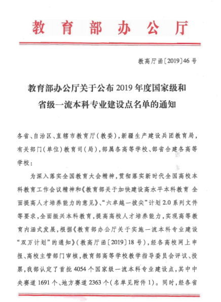 教育部于2019年4月启动一流本科专业建设“双万计划”,旨在振兴本科教育,提高高校人才培养能力,实现高等教育内涵式发展。教育部计划在2019-2021年间,认定1万个左右国家级一流本科专业点和1万个左右省级一流本科专业点。经过各高校网上申报、高校主管部门审核推荐,教育部高等学校教指委评议、投票,教育部认定了首批4054个国家级一流本科专业建设点,其中中央赛道1691个、地方赛道2363个。