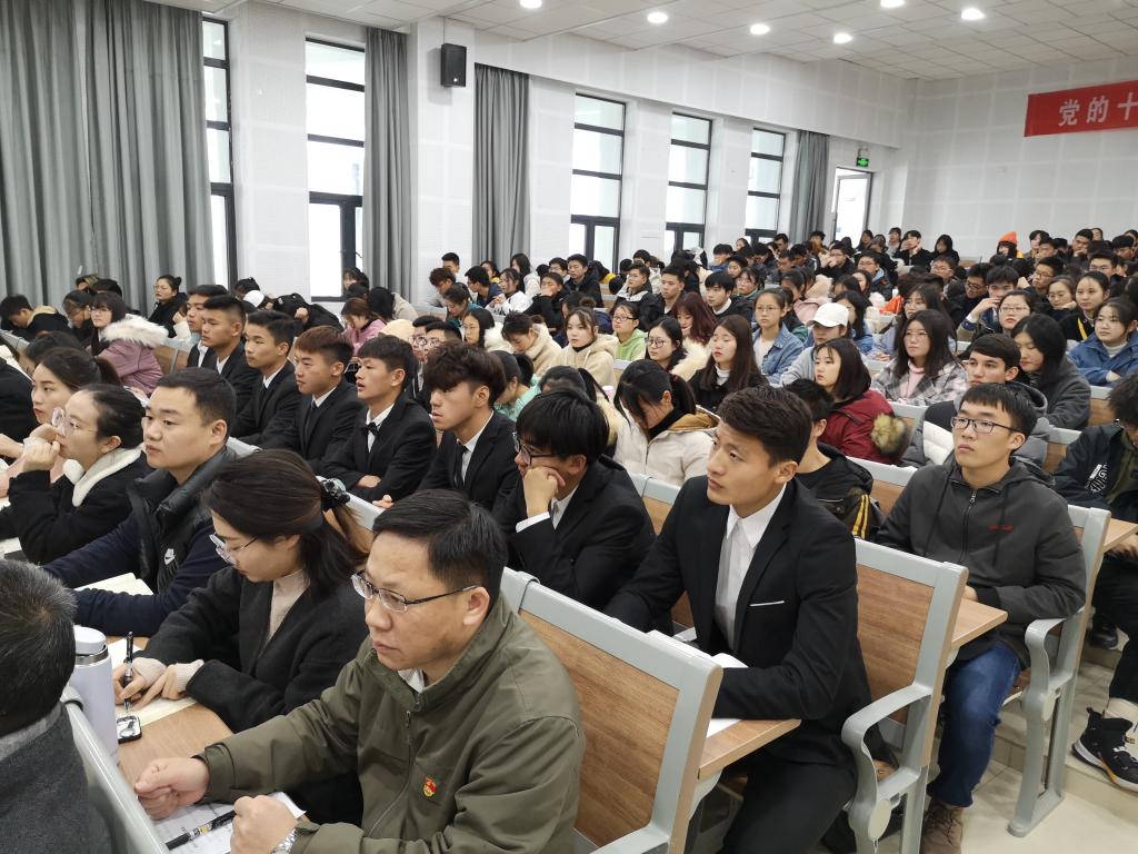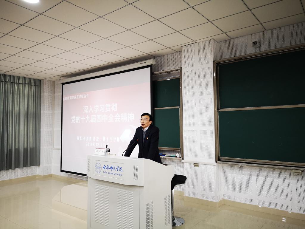 本网讯 12月13日,党委副书记、院长孙道胜在滨湖校区博学楼A108教室为2019级新生代表作党的十九届四中全会精神宣讲报告。各二级学院和相关部门负责人,辅导员老师,2019级新生代表共计300余人参加了报告会。党委委员、宣传部部长操申斌主持报告会。