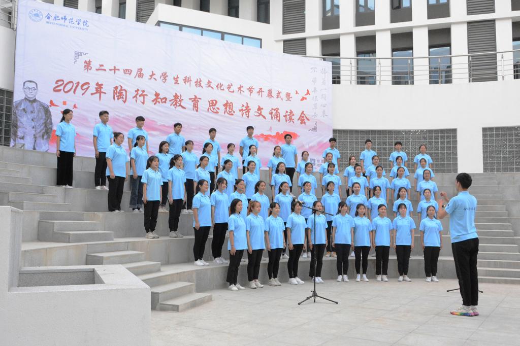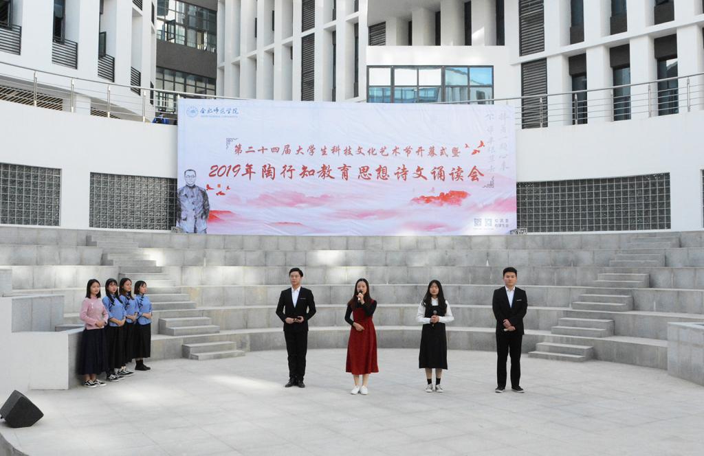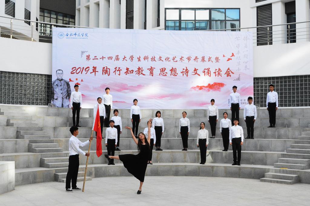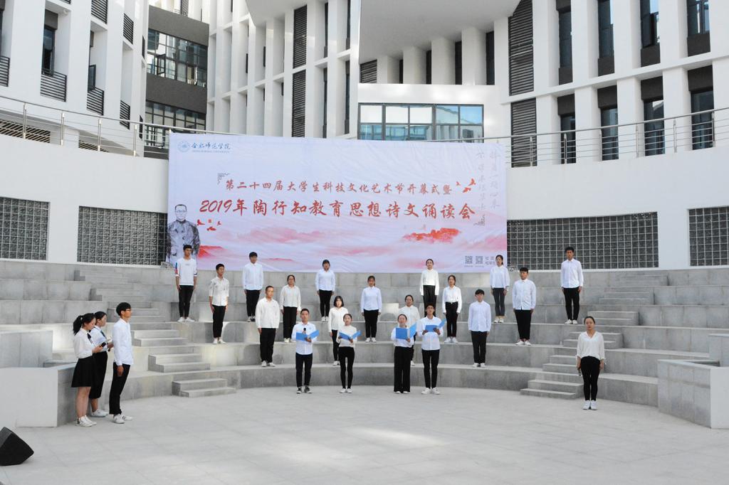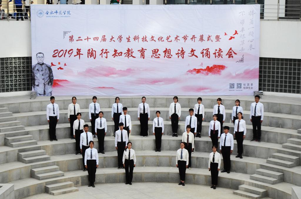 本网讯 10月31日下午,学院第二十四届大学生科技文化艺术节开幕式暨2019年陶行知教育思想诗文诵读会在滨湖校区铭传楼广场举行。院党委书记、安徽省陶行知研究会会长徐成钢,副院长谢阳群,滨湖校区综合管理办公室、后勤处、保卫处、教务处、科研处、宣传部、学工部、团委及相关二级学院负责人,各二级学院分团委书记、辅导员及2019级新生代表参加本次活动。