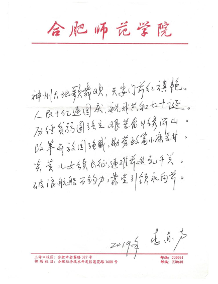 原党委书记李东方还赋诗一首,庆祝新中国成立70周年。“神州大地歌舞欢,天安门前红旗艳。人民十亿迎国庆,祝我共和七十诞。历经贫弱图强立,艰苦奋斗绣河山。改革开放国强盛,勤劳致富小康甜。炎黄儿女续长征,迎难前进克千关。破浪航船万钧力,靠党引领永向前。”