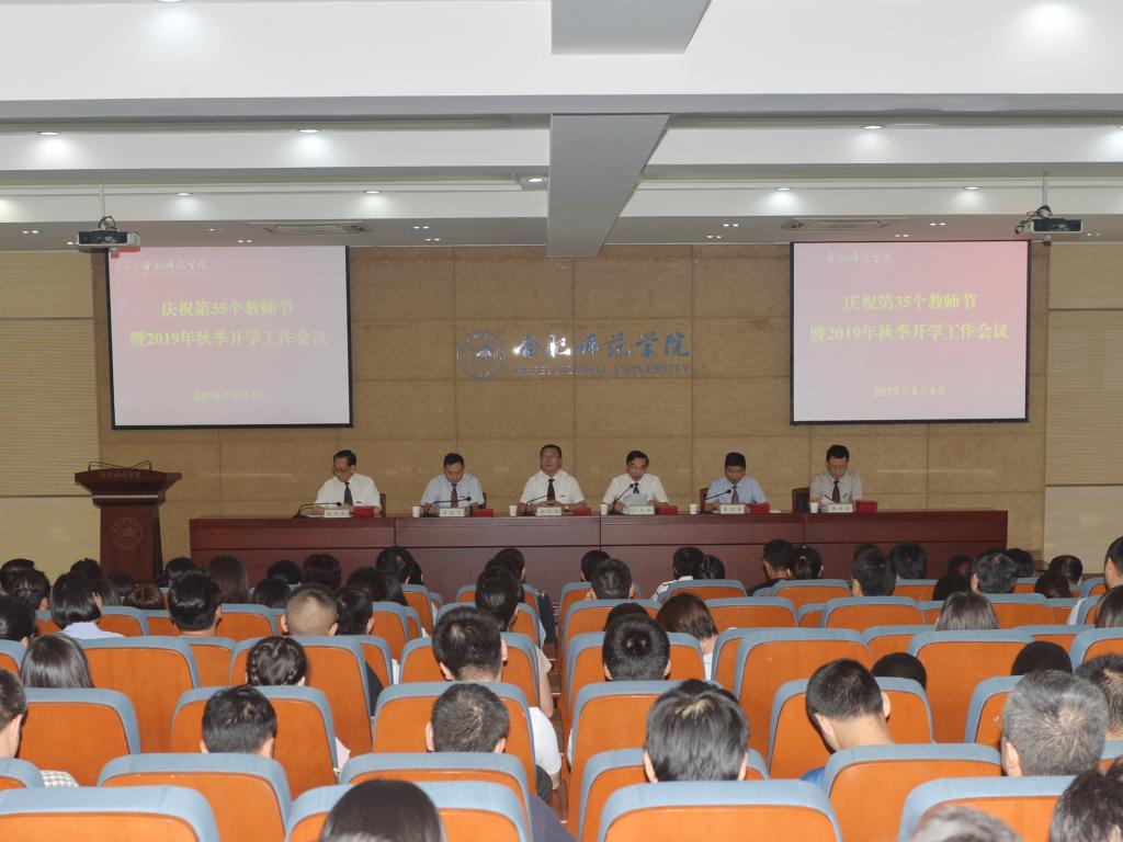本网讯 为表彰学习先进,总结上半年工作,动员部署下半年工作,9月4日下午,学院庆祝第35个教师节暨2019年秋季开学工作会议在锦绣校区学术报告厅召开。党委书记徐成钢,党委副书记、院长孙道胜,党委副书记、副院长李进华,党委副书记吴昕春,副院长姚本先,副院长曹卓良及处级干部,正高职称人员,“两委会”委员,受表彰教职工,拜师仪式教师代表,新进教职工,辅导员参加会议。徐成钢发表讲话,孙道胜主持会议。