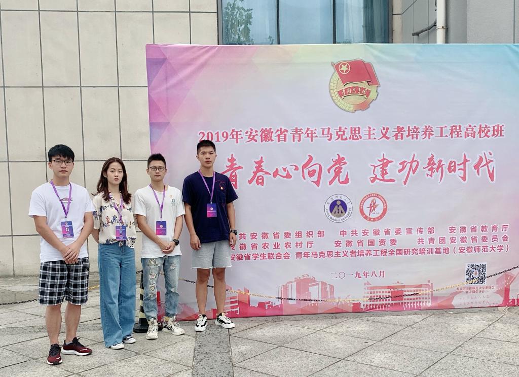 本网讯 8月25日至30日,2019年安徽省青年马克思主义者培训工程高校班集中学习培训在安徽师范大学举行,我院选派院学生会、学生社团联合会、青年志愿者联合会、“第二课堂”学分认证中心的方磊、陈琳、吴涛、侯万青4位同学与来自全省113所高校的240名大学生骨干代表参加了集中学习培训。