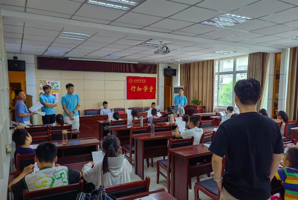 王岩一行现场观摩了“小先生”的《歌唱祖国》音乐演唱课。教学过程轻松活泼,孩子们踊跃参与。课间,王岩与“小先生”进行了深入交流,强调要牢记行知学堂创办理念,铭记师范生肩上的责任与使命,践行“爱满天下,知行合一”行知精神,与小学员们共同成长。程艾捷询问了小学员的学习收获,鼓励他们认真听讲,遵守纪律,并对“小先生”进行指导,要求“小先生”务必要把孩子们的安全放在首位,认真备课,勇于发挥专业特长,充分展现合师学子风采。