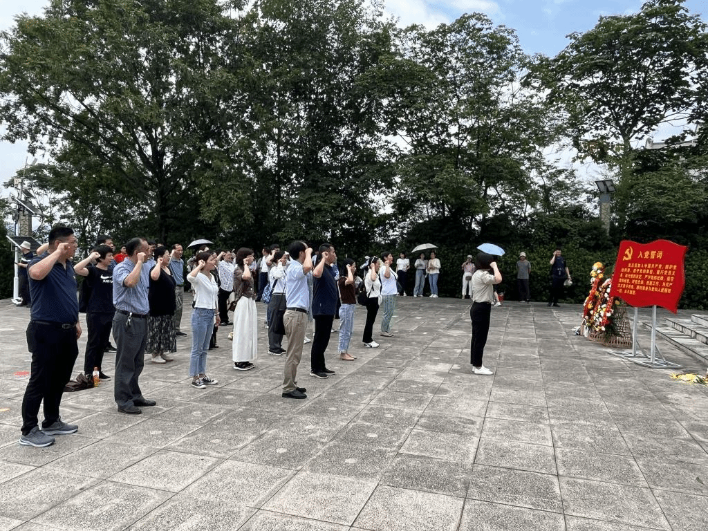 随后,全体党员沿着整洁的台阶拾级而上,来到巍峨耸立的六霍起义纪念塔前,在党总支书记刘艳的带领下,大家对着党旗重温入党誓词,用铮铮誓言表达出为党、为国家、为学校事业发展不懈奋斗的决心和信心。