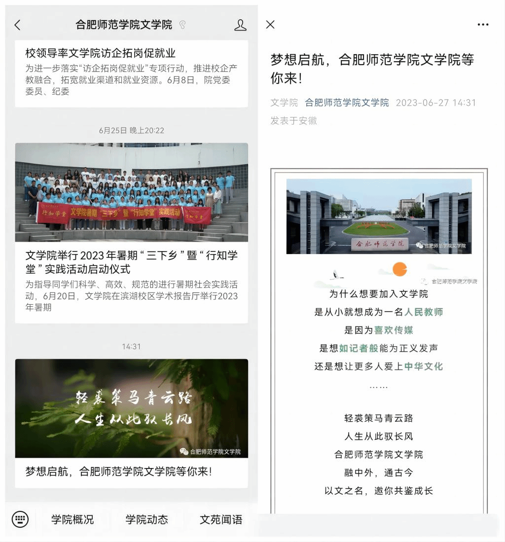 打造全媒体“微”宣传。文学院进一步加大网络宣传平台建设,利用新媒介宣传手段,配合招生宣传工作,第一时间开通官方微信公众号,设置专门板块,介绍学院情况、工作动态等内容,定期推送招生信息,拓展招生渠道,全方位、多维度宣传文学院学科专业和人才培养等情况,提升招生宣传时效。