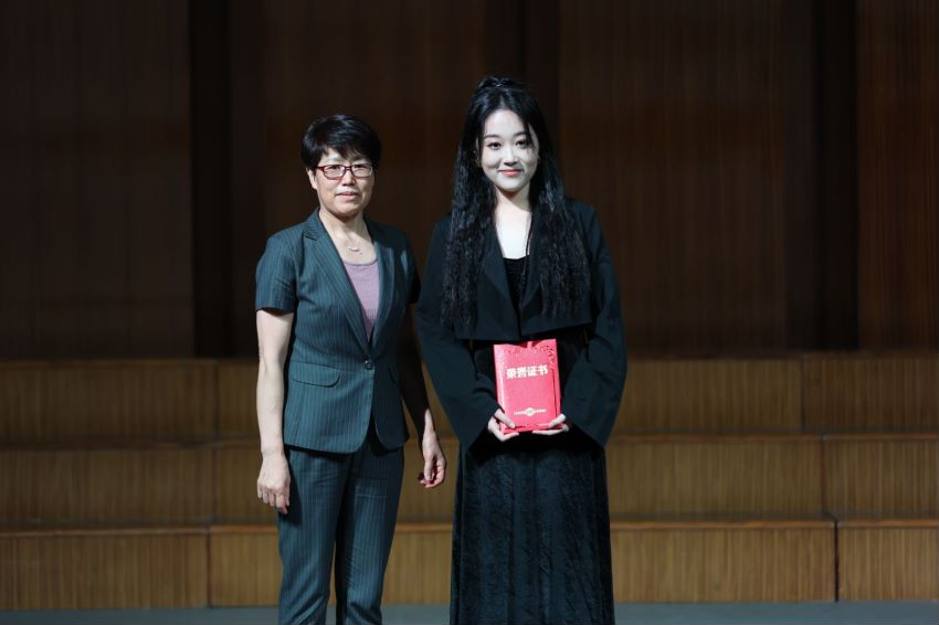 在音乐会的中场环节,音乐学院举行了2023届国家奖学金,省级、校级优秀毕业生颁奖仪式。音乐学院党委书记蔡成梅、院长李劲松、党委副书记宋辉、副院长康勤上台为获奖者颁奖及合影留恋。