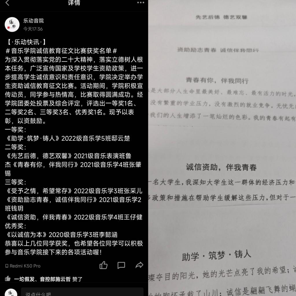 为贯彻学校资助育人的活动精神,我院面向全体学生开展资助励志青春·诚信伴我同行主题征文比赛,同学们结合亲身经历,讲述自己或身边人接受国家和学校资助,努力奋进,自强不息,恪守诚信,心怀感恩的故事。参赛作品立意新颖、体裁多样、语言表达得体。经学院初评、学校总评,共评选出优秀主题征文7篇,其中22级音乐学五班邸云楚《助学·筑梦·铸人》获一等奖;21级音乐表演班鲁杰等2人获二等奖;22级音乐学三班张采儿等3人获三等奖;2020级音乐学3班李懿涵获优秀奖。通过此征文比赛,不仅丰富了学生的课余活动,还激发学生树立诚信、感恩、励志的优秀品质。