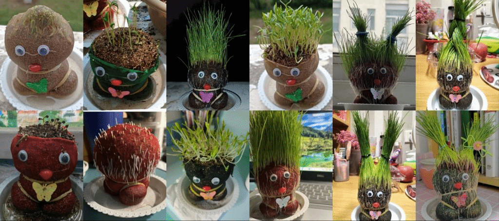 同学们将拿到的草头娃娃泡水8小时,然后放在托盘上,仅过一晚便可生根发芽,同学们纷纷感叹生命神奇的力量。一个星期之后,“娃娃”们都已长出茂密的“头发”,同学们充分发挥自己的想象力和创造力,给草头娃娃进行发型设计,一张张可爱的脸庞背后是同学们植物养成的责任心和对生命的敬畏心。