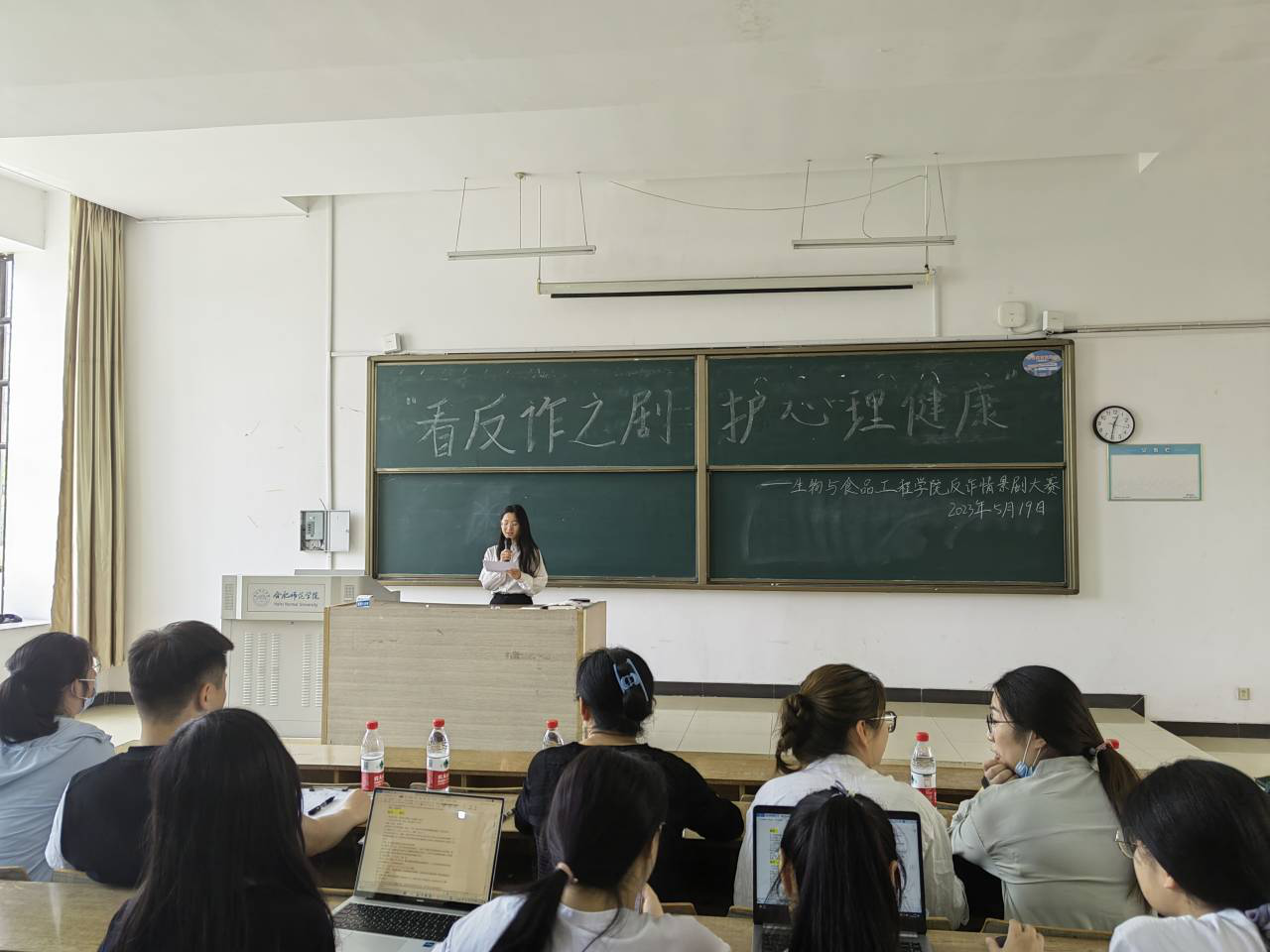 本网讯 为推进反诈意识入脑入心,进一步加强大学生心理健康教育,营造健康向上的校园氛围,发掘学生的创作能力,生物与食品工程学院于5月19日在博约楼101教室举办了以“反诈之剧,护心理健康”为主题的反诈心理情景剧大赛。本次比赛由生物与食品工程学院党委副书记杨娜,院分团委书记黄洁、辅导员杨帆、高欢和张瑜婷担任评委。