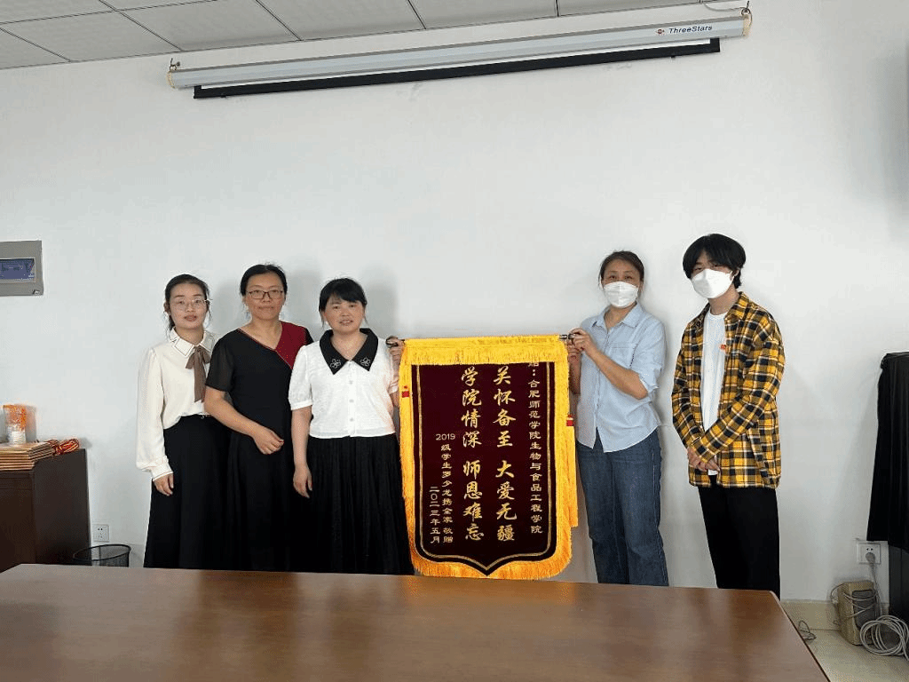 本网讯 5月18日,在行知楼1502室,生物与食品工程学院2023届毕业生罗同学及家长满怀感恩之心,向学院赠送了写有“关怀备至,大爱无疆,学院情深,师恩难忘”的锦旗,以此表达对学院领导老师的感激之情。生物与食品工程程学院副院长朱桂兰、党委副书记杨娜和毕业班辅导员高欢热情接待了学生家长。