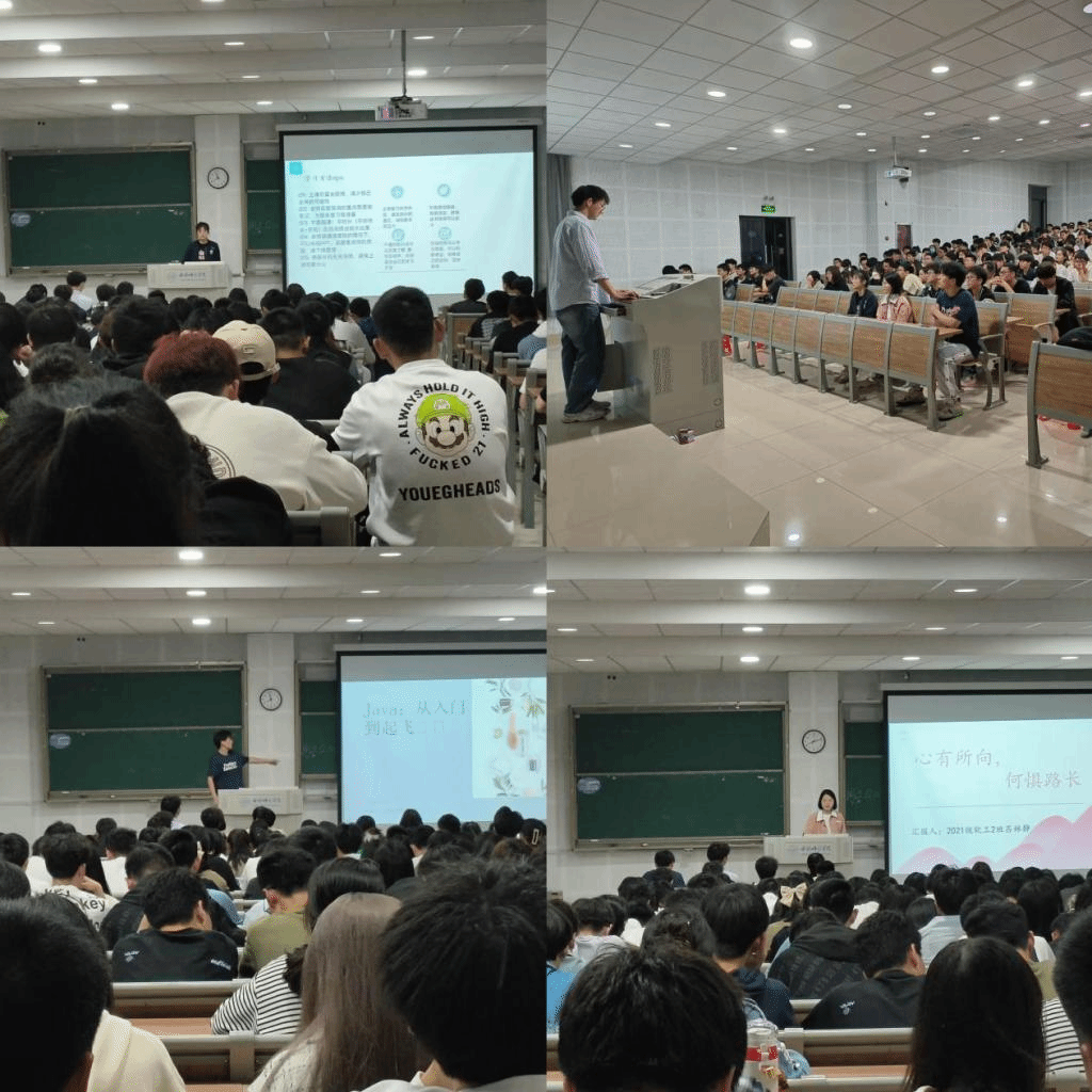 张跃同学以“勤学善思,砺能笃行”为题,分别从大学规划、学习经验和课外实践三个方面展开分享。他表示,要为自己的大学生涯做好学业规划,必须稳扎稳打,脚踏实地,避免碌碌无为、无所事事。黄安同学提出要保持良好心态,不负青春韶华,在大学生活中要对自己抱有期待,让自己在逆境中成长,但不可为了目标过于焦虑,应当保持顺其自然的心态,学会奖励自己,给自己积极的心理暗示。王锐同学从专业课程入手,建议精通一门编程语言,多去尝试并找到自己想学习并可以一直运用的编程语言,以Java为例,从入门到进阶,构建框架,为自己专业课打好基础。吕林静同学以“心有所向,何惧路长”为主题分享学习经验,认为学习离不开兴趣,努力和方法三个部分,大学要学会自主学习,合理运用网络学习资源查漏补缺。