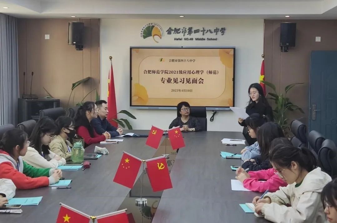 本网讯 在美丽的四月,2021级应用心理学(师范)专业的14名同学进入合肥市第四十八中学进行为期两周的见习。四十八中学副校长裴娟,政教处主任郑伟,校心理健康教育中心老师江颖以及beat365唯一官方网站心理系副教授姚琼和全体见习生们参加了此次见面会。
