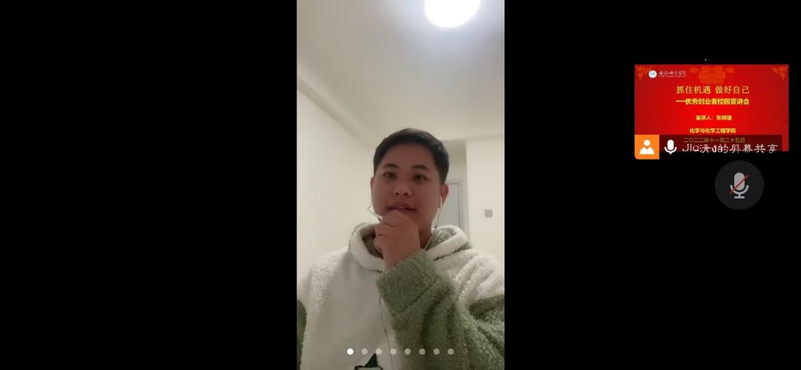 本网讯 为进一步推动2023届毕业生就业创业工作,培养大学生创新创业意识,搭建优秀校友与学生交流的桥梁。11月25日,化学与化学工程学院举办主题为“抓住机遇,做好自己”的优秀创业校友线上宣讲会。会议邀请2014级制药工程专业毕业生张明瑞宣讲。