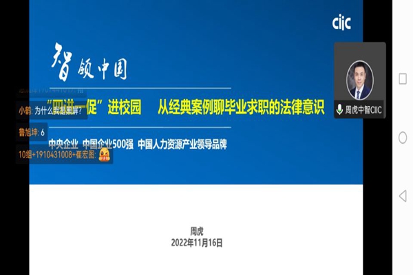 安徽省“启明星”就业指导专家团成员、拥有18年央企合规管理经验、十佳人力资源经理人周虎律师作了《从经典案例聊毕业求职的法律意识》主题宣讲。他从毕业后将遇到的职场情景、初入职场的法律小知识、毕业生应懂得的合规意识等三个方面进行具体说明,针对具体问题具体分析,为老师、同学们带来了满满干货。师生们积极在线提问,线上气氛活跃。