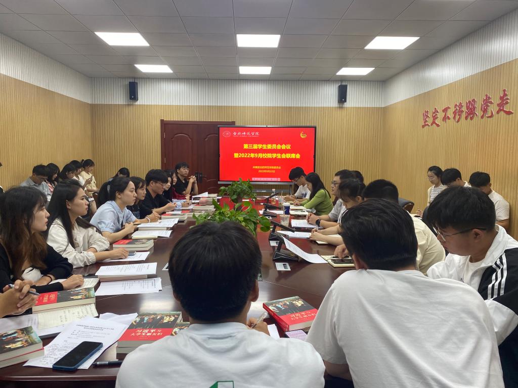 本网讯 9月22日,学院第三届学生委员会会议暨2022年9月校院学生会联席会在锦绣校区共青之家召开。院团委全体人员,学院第三届学生委员会全体委员,院学生会和各二级学院学生会负责同学参加本次会议。