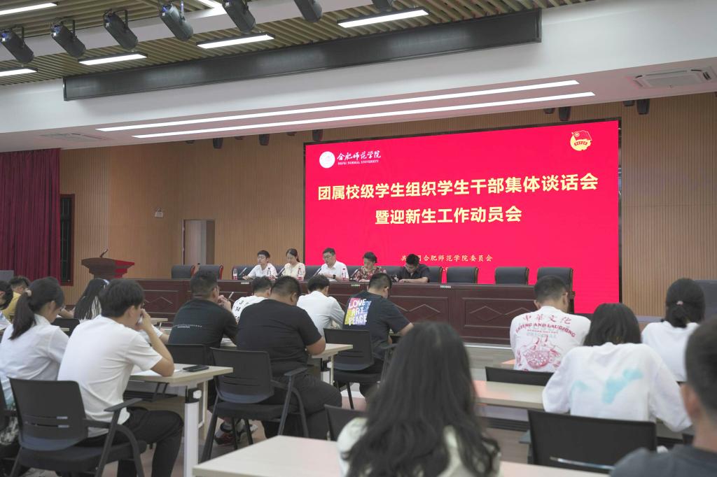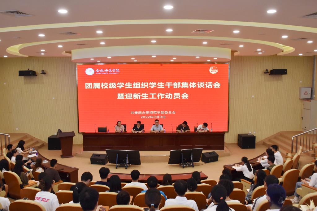 本网讯 9月8日和9日中午,院团委分别在锦绣校区大学生活动中心和滨湖校区学术报告厅召开团委所属学生组织学生干部集体谈话会暨迎新生工作动员会,院团委全体人员,院学生会、合师青年传媒中心、学生社团文化服务中心、青年志愿者联合会、“第二课堂”学分认证中心新任主要学生干部参加会议。