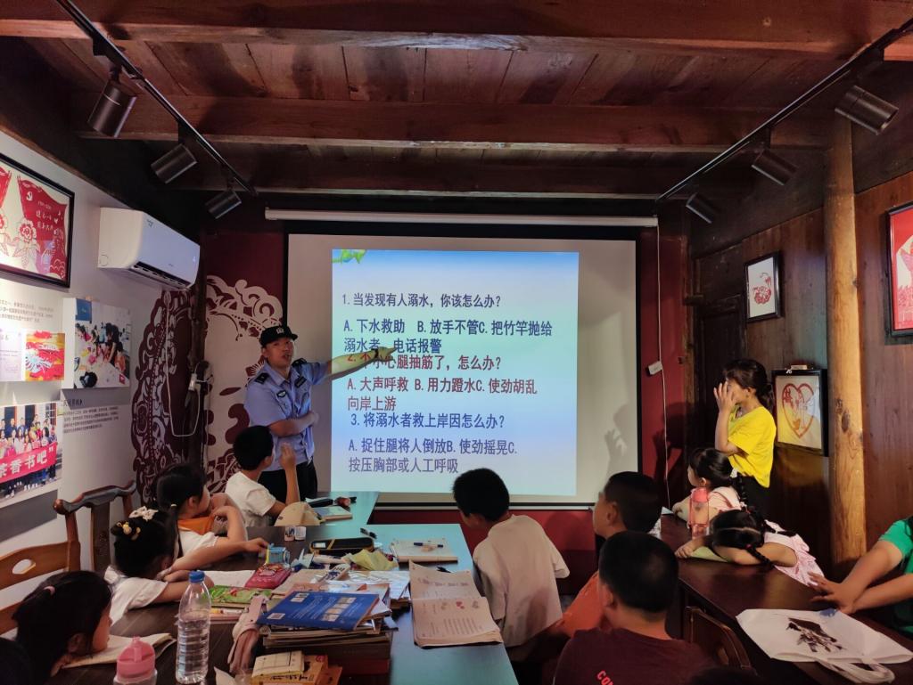 李国代表庙首镇派出所对在场小学员表示关心,并通过课上问询的方式,了解小学员最喜欢的解暑方式,据此引出本次防溺水安全教育课程。李国设身处境,就PPT放映的形式,给在场小学员讲述夏季溺水的危害,同时讲解正确的防溺水自救方法,以此增强小学员的安全防范观念。“小先生”胡迪及李艺喆就小学员自身和当地实际情况,补充阐明预防溺水的正确措施,对小学员的人身安全作出殷切瞩望,希望学堂学员能正确作好人身安全防护。庙首镇派出所同志及里仁村干部等人对两位“小先生”予以感谢,并对“小先生”的工作给予高度赞扬。