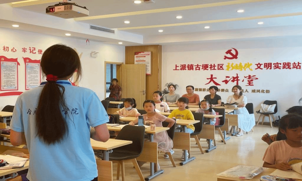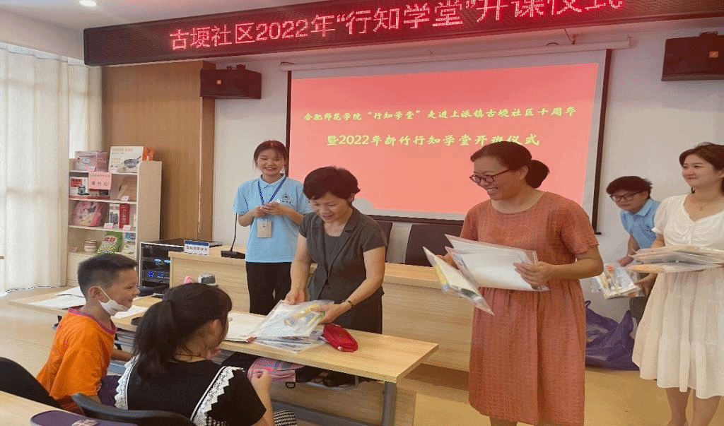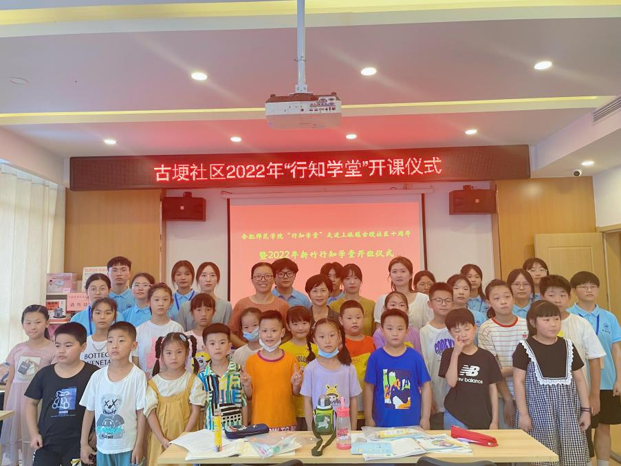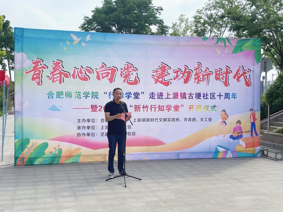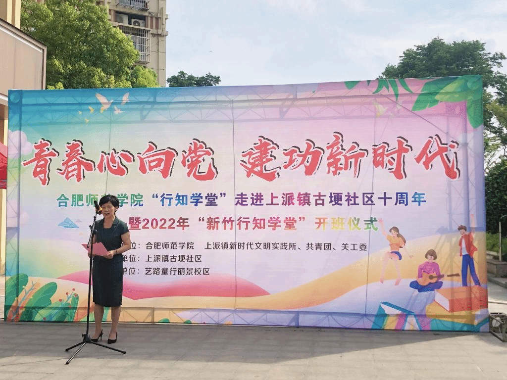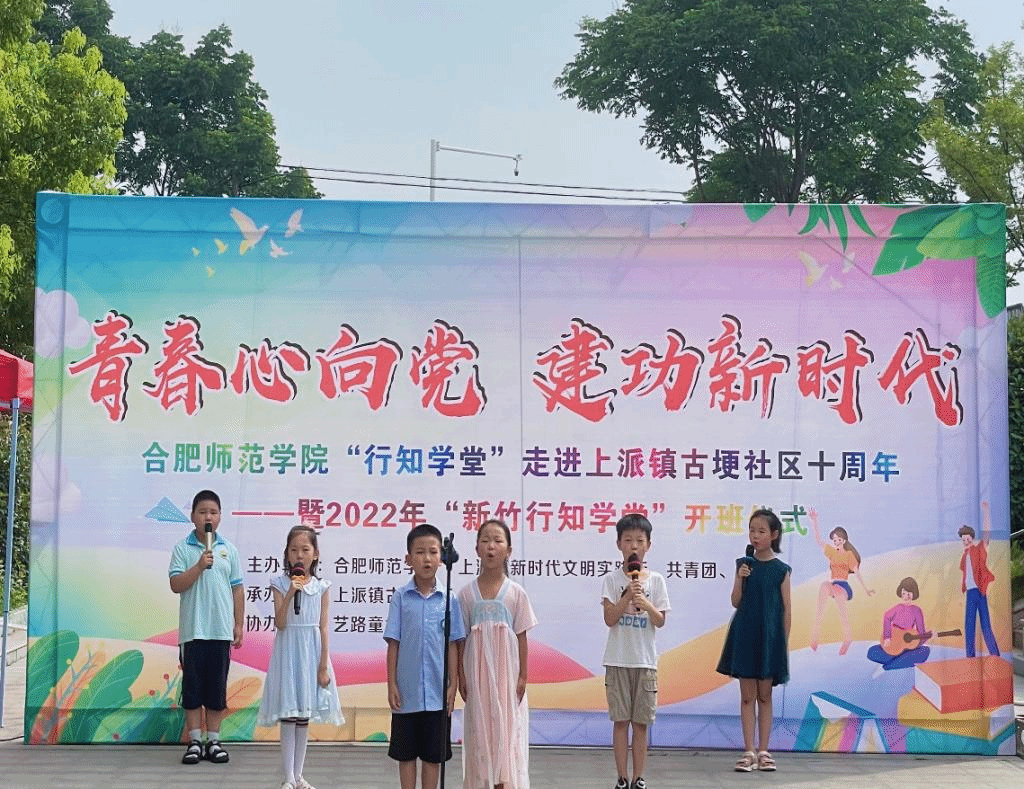 本网讯 7月4日上午,“行知学堂”走进上派镇古埂社区十周年暨2022年生命科学学院“新竹行知学堂”开班仪式在肥西上派镇古埂社区举行,社区党委书记张坤、生命科学学院党委书记郭桃芬、副书记杨娜、团委书记黄洁、指导老师梁悦、15名"小先生"、20多名小学员及学员家长共同参加,仪式由校第三届青春学习营学员何乔主持。
