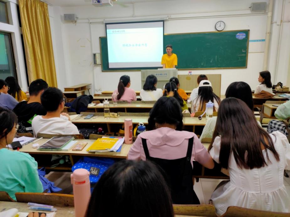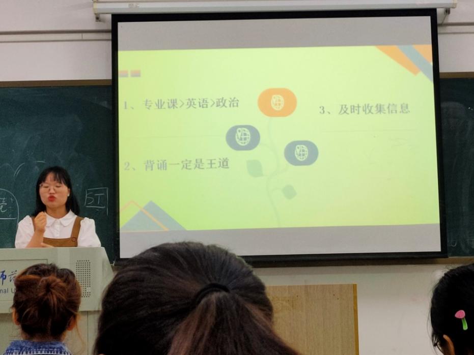 5月5日,成功考取安徽师范大学2018级应用心理学专业学生易敬超,在锦绣校区博约楼A206教室为2019级应用心理学专业的学生们做了一场考研分享。会上,易敬超从考研的基本情况介绍、各考试科目全年学习规划、心态建设三个方面进行介绍,向学生推荐考研复习资料,鼓励同学们要坚定目标不放弃。考研是一次长距离的马拉松比赛,同学们的心态建设尤为重要,要制定合适的学习规划并按时完成,并鼓励同学们要多一些笃定,多一些勇气,多一些坚持,最后终将上岸。