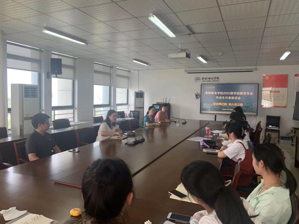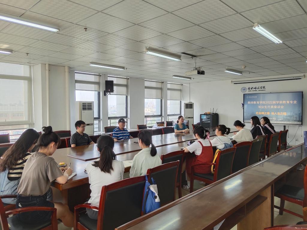 本网讯 5月25日下午,教师教育学院在行知楼710举行2022届学前教育专业毕业生座谈会,教师教育学院党委书记穆娟、副院长闫龙,学前教育系主任孙延永,学前系专任教师李辉、吴皖赣等参加座谈会,2018级学前教育中美合作班、2020级学前教育专升本毕业班学生代表参加。会议由孙延永主持。