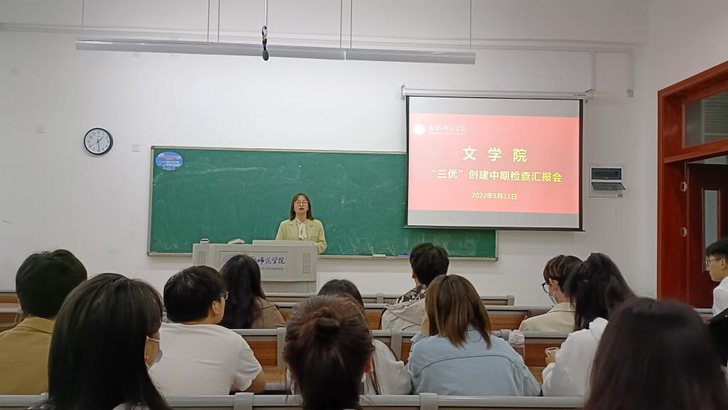 本网讯 5月1日下午,文学院在滨湖校区铭传楼B305召开了“三优”创建中期检查汇报会,辅导员李娟、疏淑进老师和各申报班级负责人参与此次会议。本次汇报会由辅导员李娟主持。