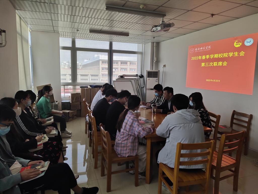 本网讯 4月22日中午,2022年春季学期校院学生会第三次联席会在锦绣校区行知楼召开。院团委挂职副书记宗彪、宣传思想部负责人王露,院学生会主席团成员、二级学院学生会执行主席参加本次会议。会议由院学生会执行主席刘浩然主持。