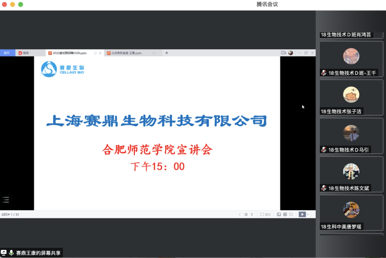 出席宣讲会的单位有上海赛鼎生物科技有限公司、南京建友制药生化股份有限公司以及安徽省昂普拓迈(Aptamy)生物科技有限公司。宣讲会上,三家单位简明扼要地通过PPT宣讲展示公司的发展历程和发展战略,并对招聘岗位、福利待遇、住宿条件以及今后的晋升空间等方面作了详细介绍,同学们积极与公司招聘人员交流,招聘人员耐心解答了同学们的问题,线上宣讲氛围浓厚。