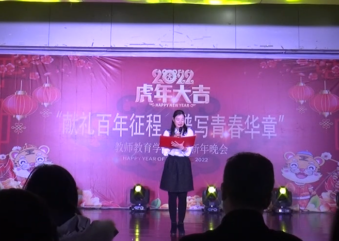 晚会伊始,穆娟代表学院为晚会致辞。她首先对学校党委、行政和相关职能部门对学院的关心和支持表示衷心的感谢,向到场的各位领导和师生们送上最诚挚的祝福。随后她总结和回顾了学院在过去一年里取得的成绩,对学院党建、专业建设、学风建设、三优创建等方面取得的优异成绩表达了衷心祝贺。同时她也对学院师生寄予新的希望,今年是一个特殊而又具有重大意义的年份,是党和人民胜利实现第一个百年奋斗目标、全面建成小康社会,正在向着全面建成社会主义现代化强国的第二个百年奋斗目标迈进的重大历史关头,希望全院师生能认真学习习近平总书记“七一”重要讲话精神,弘扬伟大建党精神,贯彻党的十九届六中全会精神,在新的一年里开好局,起好步,把握机遇,以全新的姿态迎接新年的挑战,为实现第二个百年奋斗目标、实现中华民族伟大复兴的中国梦作出新的更大贡献。