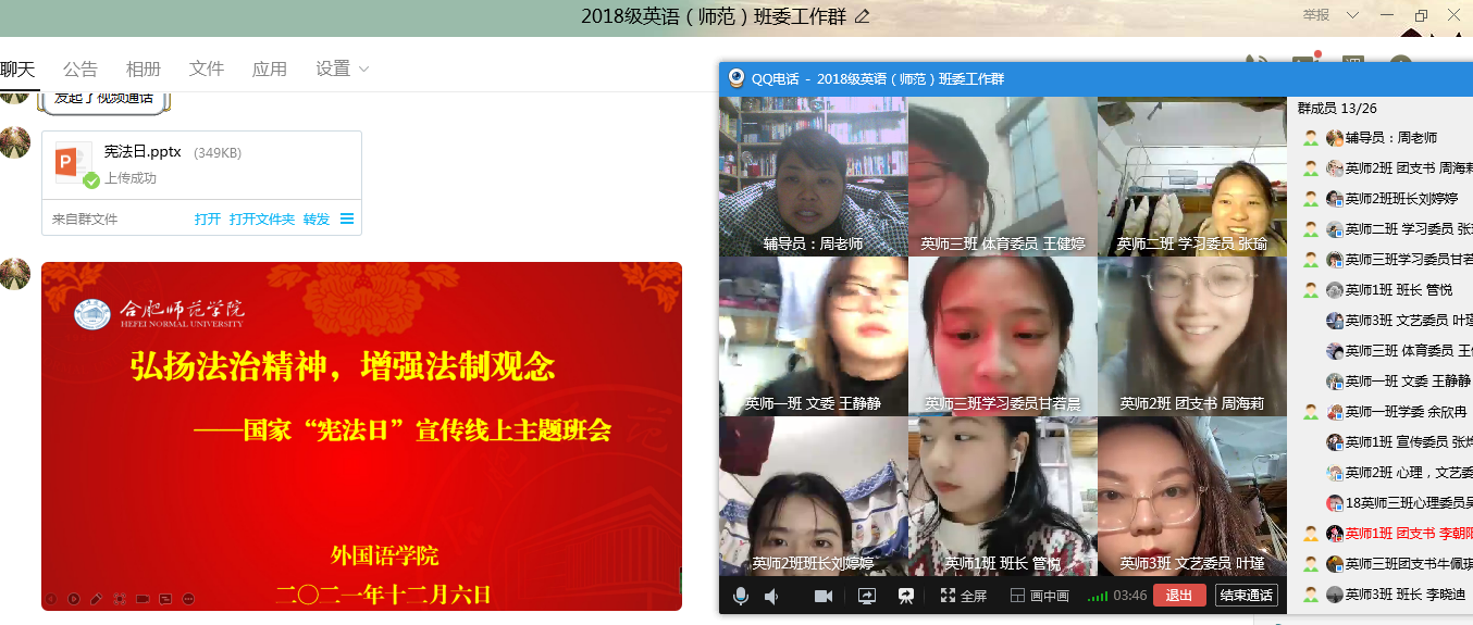 会上,辅导员冯晓敏主要从宪法的含义和地位、国家宪法日的由来和意义、习近平法治思想三大方面开展介绍,并结合《宪法知识普法动画》、《70年法治回眸:我们的自信在这里》等视频内容,带领同学们一起回顾国家的宪法发展史,并从宪法发展中感受我国所取得的伟大成就,深入理解“坚定不移走中国特色社会主义法治道路”的历史必然性。辅导员周贵勤通过线上主题班会的形式,结合具体事例,详细为学生们讲解学习宪法的重要意义,引导学生发自内心信仰宪法,拥护宪法,在宪法学习中厚植爱党爱国爱社会主义的情感。