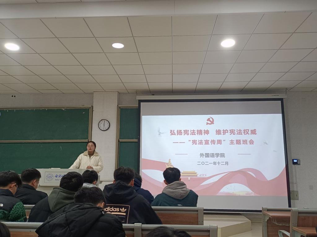 本网讯 2021年12月4日是第八个国家宪法日,为进一步弘扬宪法精神,引导学生了解宪法知识、增强法治观念,自觉维护宪法权威,外国语学院于12月5日—6日组织召开“宪法宣传周”主题班会,全院共300名学生参加此次班会。