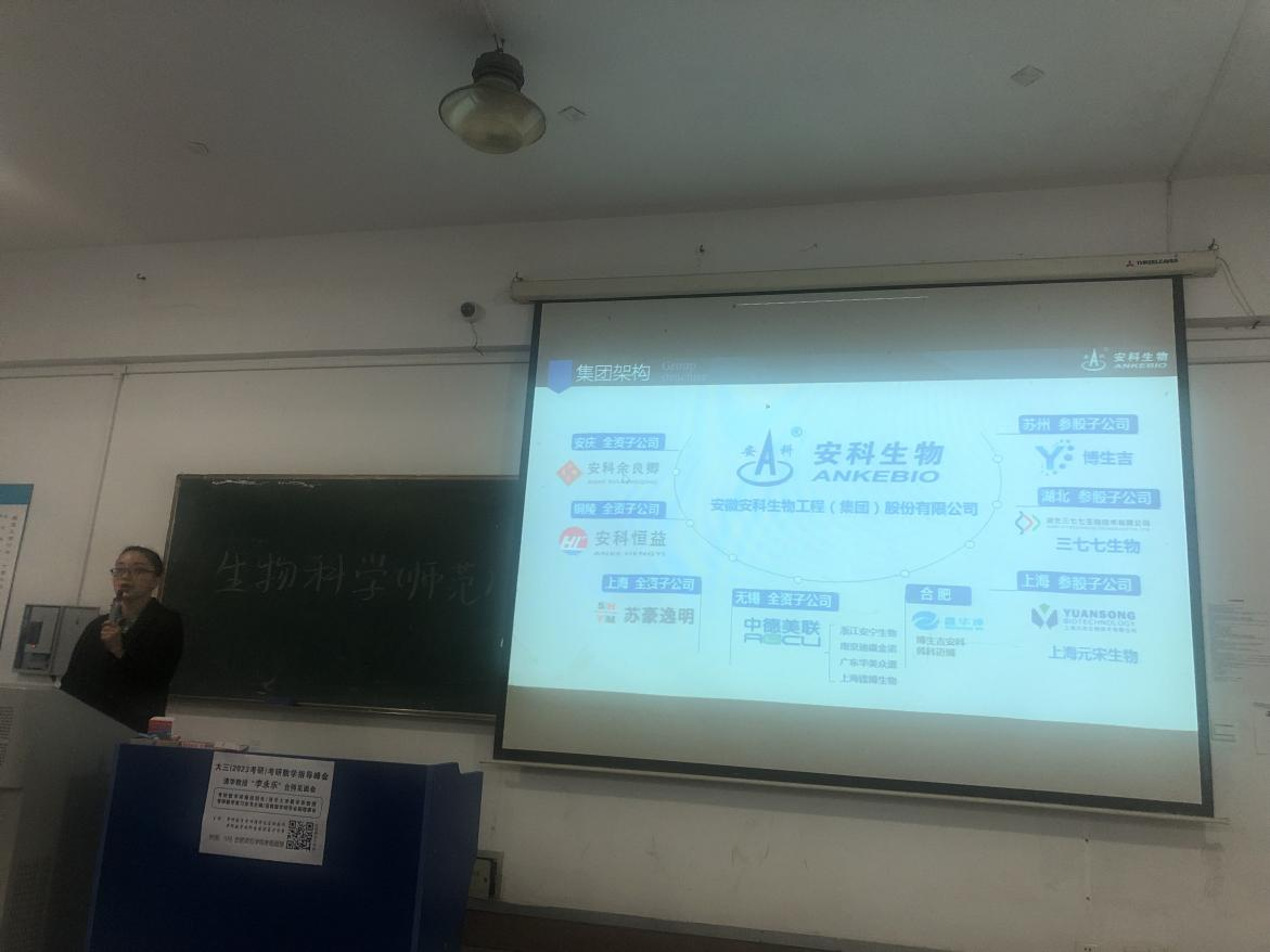 本网讯 为深入推进生命科学学院2022届毕业生就业工作,集中帮助毕业生解决就业工作中的问题困惑,生命科学学院于11月5日下午在逸夫楼A103举行了安科生物招聘宣讲会。生命科学学院党委副书记杨娜、生物技术支部书记、系主任陈金武、辅导员杨帆出席了本次宣讲会。生物技术、生物科学专业的部分毕业生参加了招聘宣讲会。