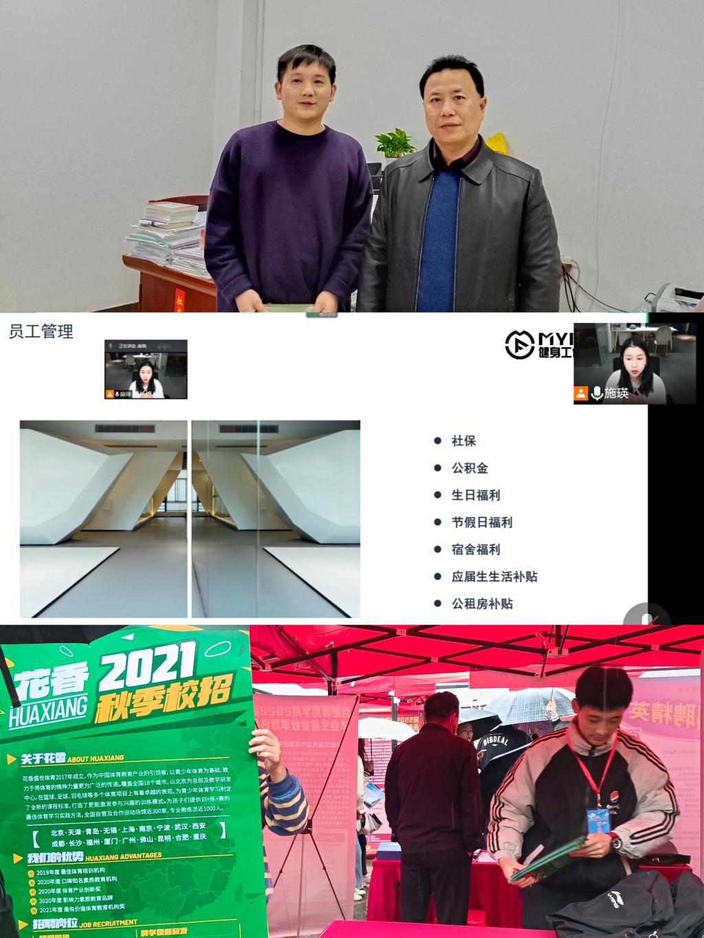 线上线下,组合发力。积极配合学校秋季双选会布展组织的同时,与省外的企事业单位杭州MYFIT健身工作室对接,通过组织腾讯会议线上招聘宣讲会,学生不出校门就能了解一些体育对口方向就业市场、招聘需求等,进一步对标提高竞争意识,做好求职择业准备。