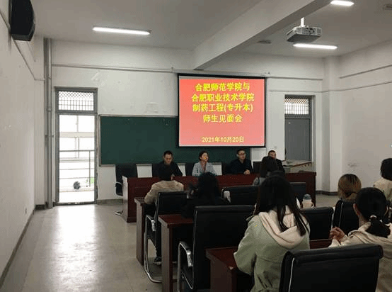 本网讯 10月20日,为进一步落实好联合培养单位本科生工作,化学与化学工程学院党委书记李红、院长董华泽、副院长朱金苗,制药工程系主任郑斌,部分教学及行政管理人员,前往合肥职业技术学院开展制药工程(专升本)本科生联合培养工作推进会。合肥职业技术学院生物工程学院书记汪春荣、院长刘修树、药学化学教研室主任范高福带领相关教职人员参会。