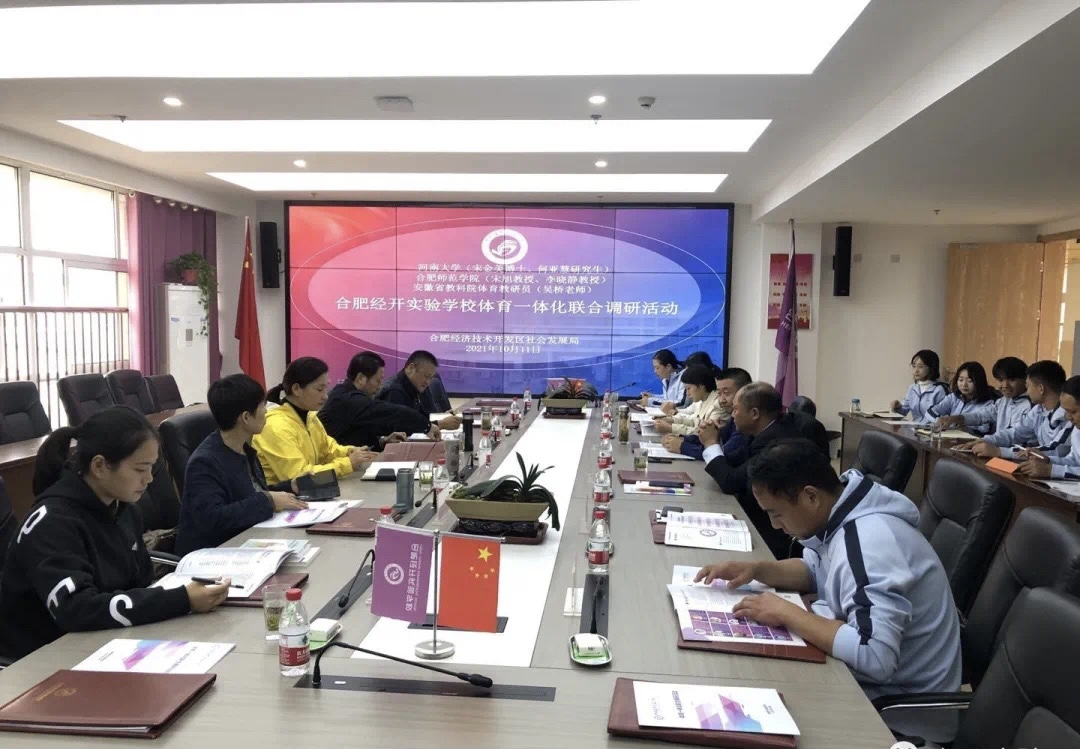 本网讯 为深化“体教融合”、推进学校体育一体化发展,促进青少年健康发展,10月11日,体育科学学院赴合肥经开实验学校参加学校体育一体化联合调研活动。河南大学体育学院博士宋金美,beat365唯一官方网站体育科学学院院长宋旭教授、beat365唯一官方网站体育科学学院李晓静教授、安徽省教科院体育教研员吴桥、合肥经开区社会发展局中心教研室主任张纪胜、合肥经开实验学校校长邵宗德、副校长刘洋等专家学者参加调研。