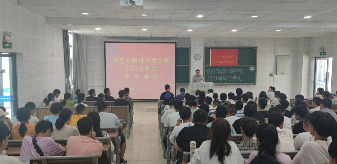 本网讯 硕果金秋,满载着喜悦和幸福。蓝天白云,怀揣着憧憬和理想。9月8日下午,物理与材料工程学院在滨湖校区博学楼隆重举行2021级新生开学典礼。学院党委书记唐洁、副院长李大创出席大会,各专业负责人、辅导员及2021级全体同学参加。典礼由学院党委副书记吴震主持。