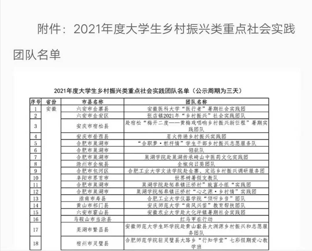 本网讯 音乐学院驻灵璧县“行知学堂”,在音乐学院分团委书记王岩和灵璧县大路乡党委委员王明的指导下,于7月28日,正式入选“2021年大学生乡村振兴类重点社会实践活动”。