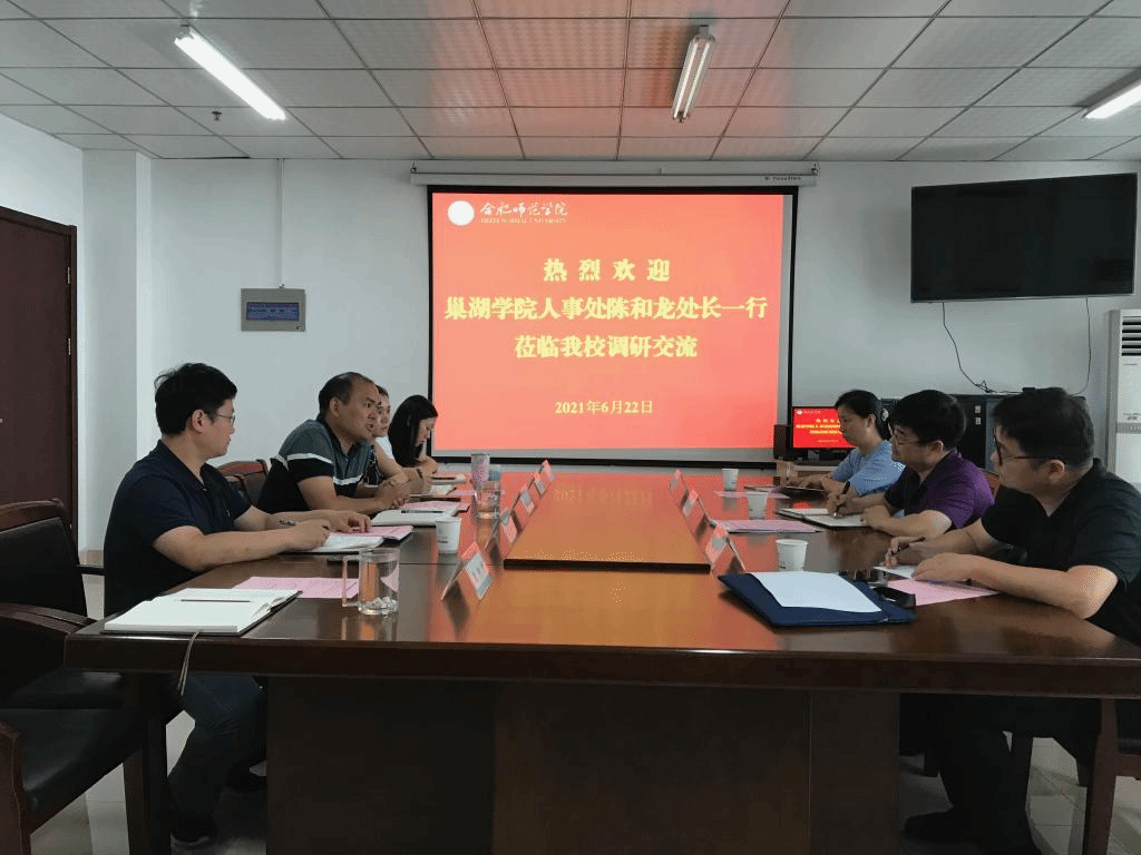 本网讯 6月22日上午,巢湖学院党委教师工作部部长、人事处处长陈和龙一行3人来beat365人事处调研交流。学校党委教师工作部部长、人事处处长吴长龙,党委教师工作部副部长、人事处副处长胡婷婷及相关科室负责人接待了陈和龙一行,并进行座谈交流。