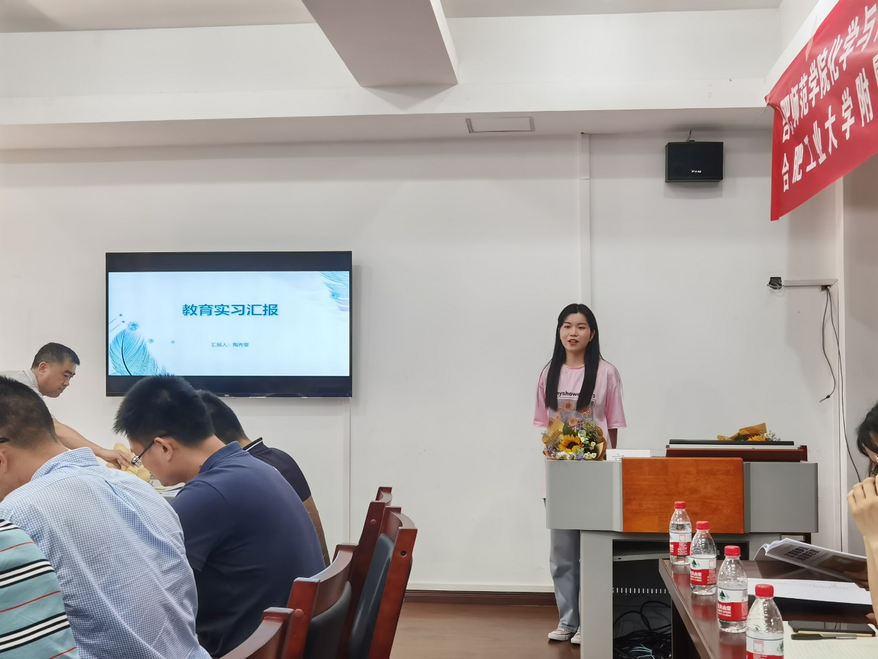实习生代表陶秀雯就十四周的安排进行汇报,他们不仅夯实了教学技能、厚植了教育情怀,还通过参加研讨会、公开课、课题研讨等活动,扩展了视野。