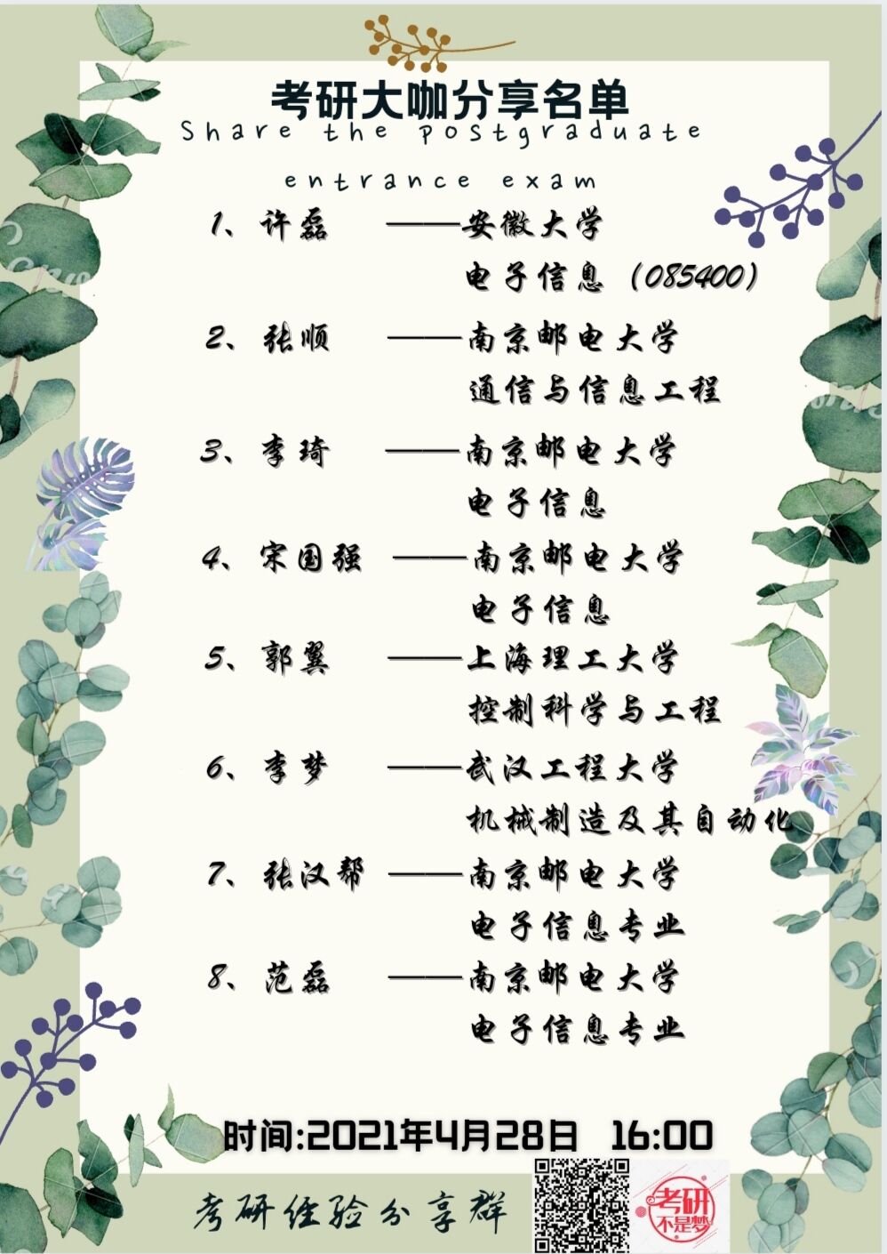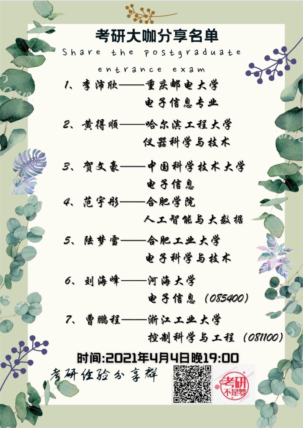 本次分享会邀请了已经在科大读研的15级贺文豪同学和今年考取南京邮电大学、武汉工程大学、上海理工大学、上海机电大学等高校研究生的17级各专业学生代表。学长学姐们分别介绍了自己的考研心得,并结合自己的复习经历讲述了在备考期间应注意的问题,包括考研各科的复习方法、考研信心的树立、考研计划、备考心态的调整、生活饮食习惯、作息时间安排,以及有关选择专业方向和复试等方面的一些经验体
