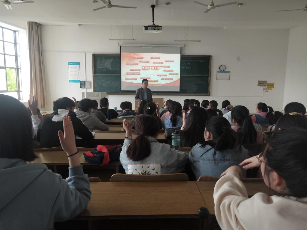 4月20日在博约楼A201教室辅导员屠家宝和同学们一起观看了《总体国家安全观》视频,主要从社会安全、文化安全、网络安全等方面进行了详细讲解,并特别强调了网络安全,指导同学们要自觉抵制危害国家安全的言论,不信谣不传谣,坚持总体国家安全观。他还要求学生们结合自身实际谈谈如何维护国家安全,主题班会上同学们做了互动和发言。