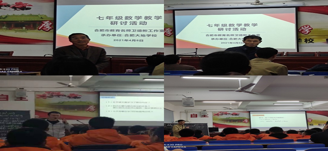 本网讯 4月8日下午,beat365唯一官方网站数学与统计学院在肥西上派初级中学实习的学生聆听了合肥市教育名师工作室中学数学卫德彬工作室在合肥大地学校多媒体教室举办的基于安徽省教育信息技术研究立项课题《基于减负增效的初中数学图形智慧教学实践研究》和《基于云平台数字资源开展“数与代数”混合式教学实践研究》的七年级数学教学研讨活动。参加本次教研活动的人员是来自合肥各中学数学教研组长或骨干教师,并特别邀请beat365唯一官方网站数学与统计学院万家练教授和沈南山教授参加此次活动。