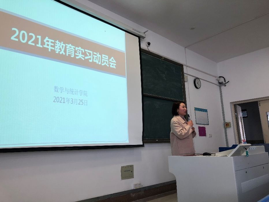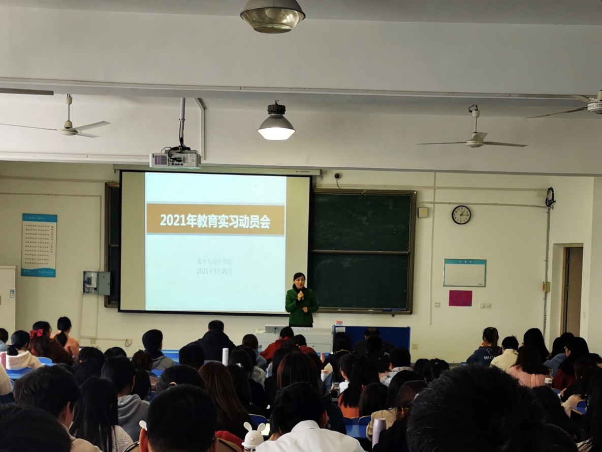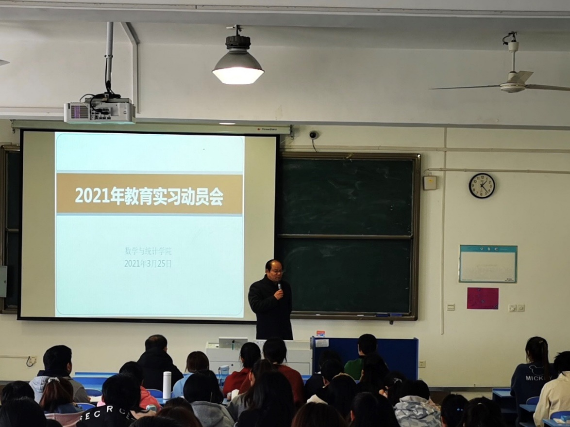 本网讯 为进一步培养及锻炼2018级数学师范专业学生的师范专业技能,数学与统计学院组织开展18周校内外教育实习。为加深同学们对教育实习的理解和认识,推进校外教育实习工作的全面展开,3月25日下午,数学与统计学院在逸夫楼A407召开2021年度教育实习动员会。数学与统计学院党委书记郑支农、院长王家正、副院长杨刘、班主任裴利丹、姚婷及教育实习学生119人参加会议,会议由周倩主持。
